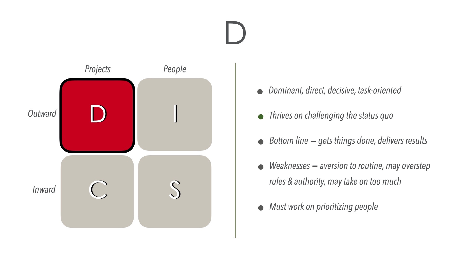 - High-achiever who gets things done (note: we often depend on Ds to get results— then get frustrated with them when they do!)