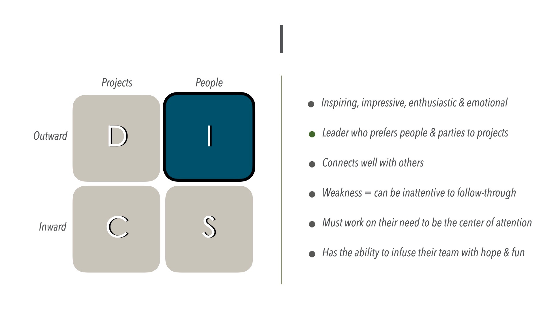 “I”s are inspiring and impressive. Enthusiastic, optimistic, impulsive, and emotional—they tend to be creative problem solvers and excellent encouragers.